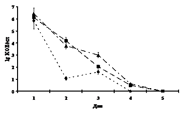 Культура энтерококков, устойчивых к эритромицину, в первые дни введения закваски в отделяемом из влагалища крыс не обнаруживалась. Затем обсемененность слизистых энтерококками нарастала, что по времени совпадало с постепенным снижением содержания во влагалище крыс патогенных микроорганизмов и увеличением количества лактобацилл и бифидобактерий (рис. 11). Наблюдаемые эффекты можно объяснить адаптацией E. faecium L5 к новым условиям существования. После элиминации возбудителей, чему прямо и косвенно способствовали пробиотические энтерококки, число последних увеличилось до 5,4 lg КОЕ/мл. Динамика процесса взаимодействия пробиотиков с резидентными представителями микробиоты влагалища и патогенными микроорганизмами ранее не описывалась.