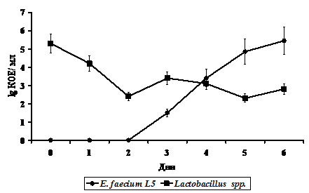 О симбиотических взаимоотношениях между L. fermentum Z и E. faecium L3 косвенно свидетельствуют и результаты совместного культивирования этих культур в средах МРС1 и молоке, с последующим высевом проб на селективные среды. Доказано, что данные бактерии не ингибируют рост друг друга. В то же время, совместное культивирование энтерококков с L. plantarum 8Р-А3 и L. acidophilus EP 317/402 вызывало замедление динамики роста E. faecium L3, существенное снижение их концентрации (более чем в 1000 раз) через 24 часа инкубации по сравнению с контрольными пробами (без лактобацилл) и при инкубировании с L. fermentum Z.