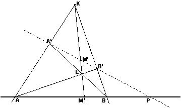 и, при этом пары точек АВ и МР разделяют друг друга. Это и означает, что пары точек А, В и М, Р (а вместе с ними и А', В' и М', Р) образуют гармоническую четверку. Заметим, что положение точки Р на прямой АВ определяется только точками А, В, М, и не зависит от выбора вспомогательных точек К и L.