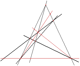 Шесть прямых дадут еще три новых точки пересечения в дополнение к уже имеющимся четырем. Соединим эти три точки еще тремя прямыми. Их называют диагоналями четырехвершинника. Каждая из диагоналей пересекает стороны четырехвершинника в четырех точках. И каждая из этих четверок – гармоническая.