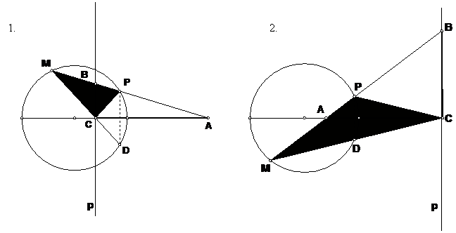 По предыдущей задаче прямые МС и МА пересекают окружность в точках D и Р, симметричных относительно диаметра. Отсюда следует, что прямая СА является биссектрисой угла С в треугольнике МРС. В случае (1) – это внешний угол, в случае (2) – внутренний. Прямая р, перпендикулярная диаметру, является биссектрисой смежного угла. Биссектрисы СА и СВ пересекают основание треугольника СМР в точках А и В, следовательно, АВ, МР – гармоническая четверка.