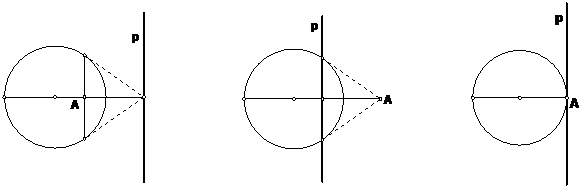 Прямая р называется полярой точки А. Точка А называется полюсом прямой р. Если полюс лежит внутри окружности, то поляра не пересекает окружность, если полюс лежит вне окружности, то поляра пересекает окружность. Легко видеть, что если точка А лежит на окружности, то ее полярой будет касательная в точке А. Полярой центра окружности служит бесконечно удаленная прямая. Если поляра проходит через центр, то ее полюс – бесконечно удаленная точка.