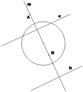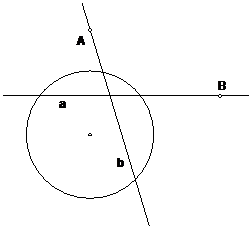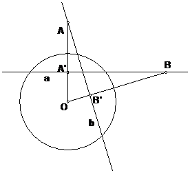 Если же прямая m проходит через центр окружности, то поляры точек А и В параллельны или, другими словами, прямые а и b пересекаются в бесконечно удаленной точке. Следовательно, полюсом прямой, проходящей через центр окружности является бесконечно удаленная точка.