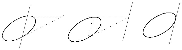 С проективной точки зрения никакой разницы между ними нет. Различие состоит лишь во взаимном расположении конического сечения (или, как часто говорят «коники») и бесконечно удаленной прямой. Эллипсом назовем коническое сечение, пересекающее бесконечно удаленную прямую, параболой – коническое сечение, касающееся бесконечно удаленной прямой, и гиперболой – если оно пересекает бесконечно удаленную прямую. Асимптоты гиперболы – это касательные в бесконечно удаленных точках.