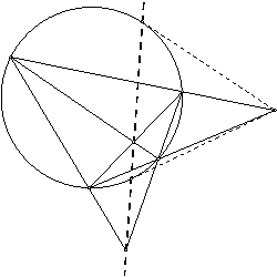 Пусть точки A, B, C, D лежат на окружности, а пары прямых АВ и CD, ВС и AD, АС и BD пересекаются соответственно в точках Р, Q, R. Тогда высоты треугольника PQR пересекаются в центре окружности.