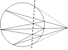 Полученный чертеж можно воспроизвести, начиная с одной из точек А, В или С. Достаточно провести через нее любые две прямые, которые пересекут конику в четырех точках, а потом достроить остальные стороны и диагонали четырехвершинника. Теперь мы можем построить поляру любой точки относительно любого конического сечения. Таким образом, если дана любая точка вне конического сечения, можно построить две касательные при помощи одной линейки.