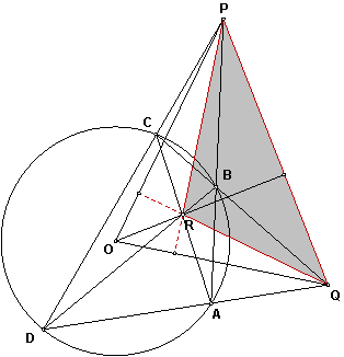 Проводя три диагонали вписанного четырехвершинника ABCD, получаем автополярный трехвершинник PQR. Каждая его вершина является полюсом противоположной стороны. Значит, поляра PQ перпендикулярна прямой ОR, соединяющей полюс R и центр окружности O. Точно так же перпендикулярны прямые PR и OQ, а также QR и ОР. Исключая из формулировки полюса и поляры, получаем теорему Брокара.