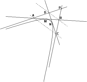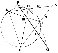 В то же время из принципа двойственности следует, что поляру точки S можно построить, соединив полюса Р и Q прямых АВ и CD. Эти полюса легко найти, как точки пересечения касательных в вершинах А, В и C, D. Значит, точки P, Q, M лежат на одной прямой.