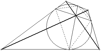 Первое и главное построение гармонической четверки связано с полным четырехвершинником. Естественно, поэтому, попытаться связать с ним и построение поляры. Для этого достаточно рассмотреть четырехвершинник, вершины которого лежат на коническом сечении. Проводя три его диагонали, получаем требуемое построение.