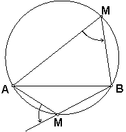 Для того, чтобы дать утвердительный ответ на этот вопрос, вспомним другое определение окружности. Возьмем на евклидовой плоскости две произвольные точки А и В. Окружностью назовем геометрическое место точек М таких, что направленный (!) угол ÐАМВ является постоянным и равным a. Направленный угол понадобился, чтобы, во первых, не говорить про углы a и 180° – a, а во-вторых, чтобы не удвоить окружность.