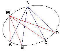 Если теперь взять на окружности четыре точки A, B, C, D, то для любой точки М, лежащей на окружности, сложное отношение прямых (MA MB, MC MD) будет одним и тем же. Это следует из того, что вписанные углы, опирающиеся на одну дугу, равны, а сложное отношение четверки прямых выражается через синусы углов между ними.