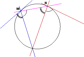 Таким образом, чтобы задать два пучка, порождающих окружность, нужно провести всего пять прямых. Разумеется, три прямые, проходящие через точку М, можно выбирать произвольным образом. Затем на одной из них выберем точку N и проведем через нее еще две прямые, так чтобы соответственные углы оказались равными (см. чертеж).