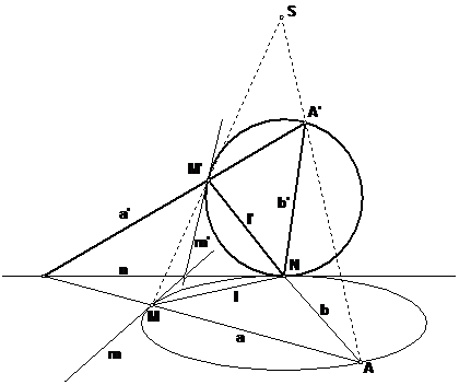 Поскольку мы рассматривем отображение, не являющееся перспективным, то прямая l является образом прямой m из пучка a, а ее образ – это прямая n из пучка b. (Для окружности прямые m и n были касательными в вершинах пучков, они же будут касательными и к конике.) Выберем еще в пучке a любую прямую а, а в пучке b – ее образ b. Точку пересечения прямых а и b назовем А. Проективное отображение полностью задается тремя парами соответственных элементов. В первом пучке возьмем прямые m, a, l, а в другом – их образы l, b, n.