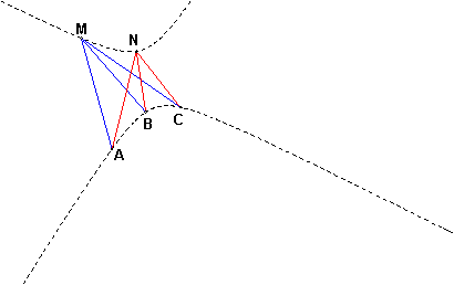 Новое определение конического сечения ставит перед нами естественную задачу на построение. Возьмем два пучка с вершинами М и N. Чтобы задать проективное отображение, достаточно выбрать в каждом пучке тройку прямых: a1, b1, c1 – в первом пучке и a2, b2, c2 – во втором. Три точки пересечения соответствующих прямых А, В, С лежат на конике. Кроме того, коника должна проходить еще и через точки М и N.