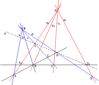 Пусть прямые a1, b1, c1, d1 пересекают прямую АВ в точках A, B, C1, D1. Тогда (a1b1, c1d1) = (AB, C1D1). Построим теперь центральную проекцию прямой АВ на прямую ВС. Центром проекции выберем точку S, в которой пересекаются прямые c1 и a2. Проекциями точек A, B, C1, D1 будут точки A2, B, C, D2. (AB, C1D1) = (A2B, CD2). Соединяя точки A2, B, C, D2 с точкой N, получаем три данные прямые a2, b2, c2 и четвертую прямую d2.