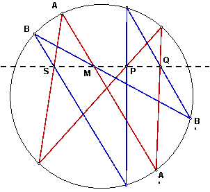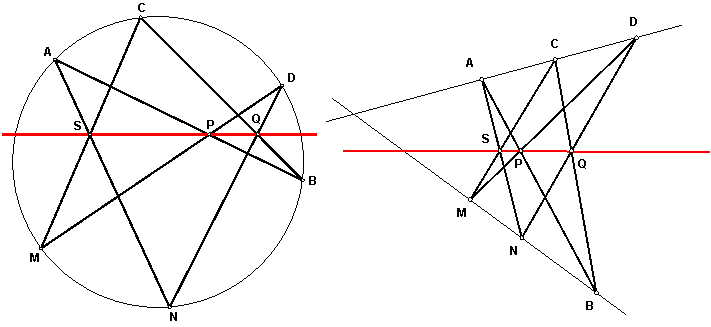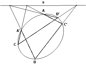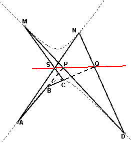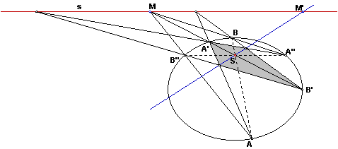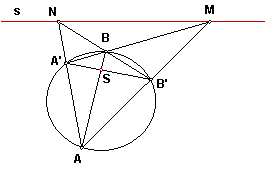 Действительно, прямые А'В и АВ' пересекаются на оси s. Поляра точки пересечения М проходит как через полюс S, так и через точку пересечения диагоналей АВ и А'В'. Но полюс уже лежит на прямой АВ, откуда и следует справедливость утверждения. Кроме того получаем, что и точка N пересечения АА' и ВВ' также лежит на оси s.
