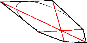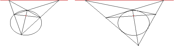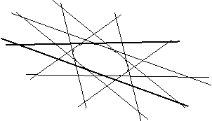 Точки пересечения соответственных прямых превратятся в прямые, соединяющие соответственные точки. Как мы только что выяснили, эти прямые являются касательными к конике. Значит оболочку коники можно представить, как множество прямых, соединяющих пары соответственных точек при проективном отображении одной прямой на другую.