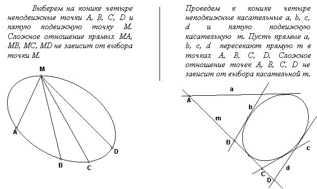 Выберем на конике четыре неподвижные точки A, B, C, D и пятую подвижную точку М. Сложное отношение прямых МA, МB, МC, МD не зависит от выбора точки М.