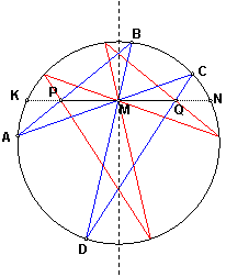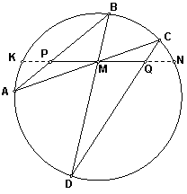 Пусть хорды окружности АС, BD и KN пересекаются в точке М, а прямая KN пересекает прямые АВ и CD и точках Р и Q. Если точка М является серединой хорды КМ, то MP = MQ.