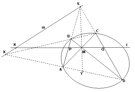 Чтобы убедиться в этом построим полный четырехвершинник с вершинами A, B, C, D, который позволяет провести поляру m точки М. Пусть эта поляра пересекает прямую l в точке К. Положение точки К на прямой l зависит только от коники и точки М.