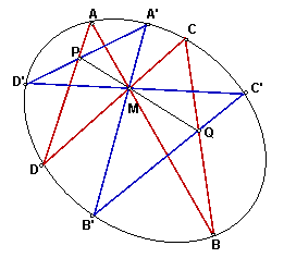 Значит, (А0В0,С0D0) = (А1В1,С1D1), но по определению сложного отношения четырех точек коники, равному отношению четырех прямых, проходящих через точку М', (А0В0,С0D0) = (AB, CD). Значит, (А1В1,С1D1) = (AB, CD), и это равенство не зависит от выбора точек М и М'.