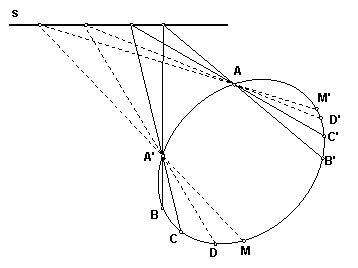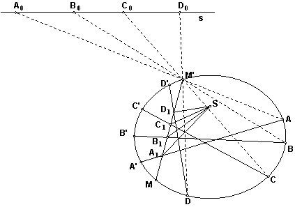 Эти точки лежат на полярах точек А0, В0, С0, D0. Все эти поляры проходят через точку S, полюс оси s. При этом сложное отношение четырех поляр равно отношению полюсов (А0В0,С0D0).