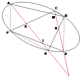 (АС, DB) = (AK, LB). Точно так же рассматривая пучок с центром в точке Q, получаем, что (АС, DB) = (MС, DN). Следовательно, (AK, LB) = (MС, DN), и, значит, существует проективное отображение прямой АВ на прямую CD, при котором точки A, K, L, B переходят в точки M, С, D, N. Прямые, соединяющие соответственные точки отображения, принадлежат оболочке некоторой коники, что и требовалось доказать.