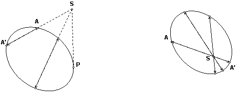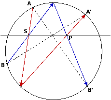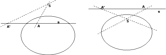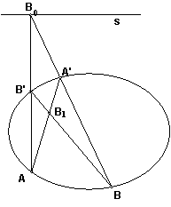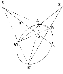 Построим точку Р пересечения прямой А'В с осью s. потом проведем прямую АР до пересечения с коникой в точке В'. Нетрудно заметить, что поскольку ось s является полярой точки S, то прямая ВВ' проходит через полюс S. Более того, то же самое построение, будучи примененным к точке В', приведет обратно к точке В.