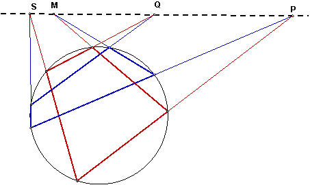 Вместо окружности возьмем произвольную конику. Точка М пусть будет не серединой хорды, а произвольной точкой на некоторой прямой. На нашем чертеже эта прямая пересекает конику, хотя это совсем не обязательно. Выберем на прямой l еще одну точку Р и проведем через нее какую-нибудь прямую, пересекающую конику в точках А и В. Теперь проведем прямые АМ и ВМ до пересечения с коникой в точках С и D. Пусть прямая CD пересекает прямую l в точке Q.