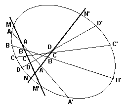 Выберем теперь две прямые ММ' и NN'. Получается, что для любой четверки прямых АА', ВВ', СС' DD' сложное отношение точек их пересечения с прямыми ММ' и NN' будет одним и тем же. Значит, отображение коники на себя порождает отображение прямой ММ' на прямую NN', откуда и следует утверждение теоремы.