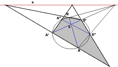 Прямые АА' и ВВ' входят в линейную оболочку порожденной коники, то есть являются касательными к ней. Построим теперь еще две касательных. Для этого применим отображение к точкам А' и В' и получим точки А'' и В''. Прямая А''В'' также проходит через полюс S, а прямые А'А'' и В'В'' касаются порожденной коники. При этом точка пересечения прямых А'А'' и В'В'' опять же лежит на оси s.