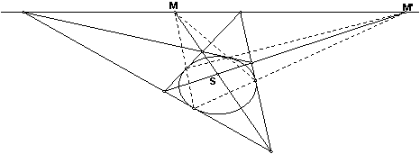 Возьмем на оси отображения любую точку М и проведем прямую MS, точки ее пересечения с коникой обозначим А' и В'. Построим теперь точки А, В, А'', В'' (обозначения предыдущей теоремы). Получаем, что диагональ четырехсторонника, описанного вокруг порожденной коники, является полярой точки М. Та же диагональ SM' будет полярой точки М и относительно исходной коники. Это следует из того, что она проходит через точки пересечения прямых АА' и В'В'', ВВ' и А'А'', каждая из которых лежит на поляре.