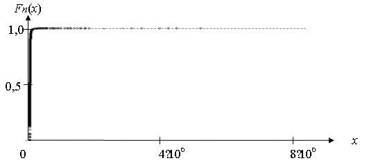 Обратим внимание, что функция на рис. 6 имеет вид функции распределения с тяжелым хвостом, что отслеживается по оси абсцисс (величина масштаба представляемых значений по оси абсцисс имеет порядок 106, и такие значения встречаются достаточно редко, в хвосте распределения). Однако и на рис. 5 хвост распределения убывает медленнее, чем экспоненциальный.