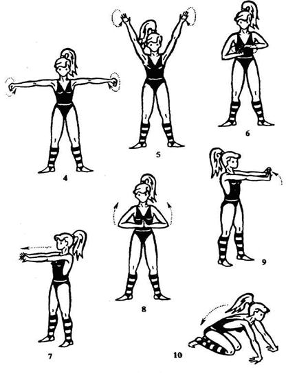 3. И. П. — ноги врозь, руки вперед, пальцы в «замок». Приподнимая руки, согнуть их в локтевых суставах за голову и резко выпрямить в исходное положение.