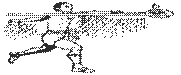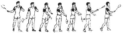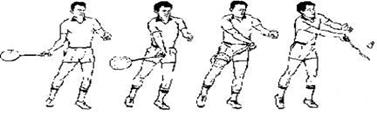 Замах. Центр тяжести (ЦТ) равномерно распределен на обе ноги, левая впереди, головка ракетки у левого пле-ча. Поворачивая плечи вправо, ЦТ переносится на пра-вую ногу, рука поднимается чуть вверх и отводится на-зад, кисть с ракеткой также отводится назад. В этот момент выпускается волан чуть впереди себя.