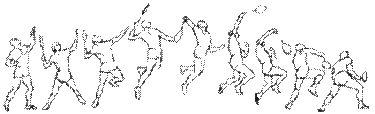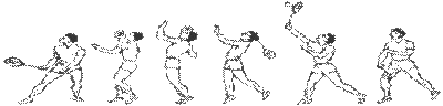 Удар. Начинается с последовательного раскручивания всех частей туловища. Вначале разворачиваются плечи влево, затем выпрямляется рука и, наконец, запястье с ракеткой. Ломаная линия, образованная всеми состав-ляющими, распрямляется и к моменту удара образует одну прямую, совпадающую с плоскостью удара.