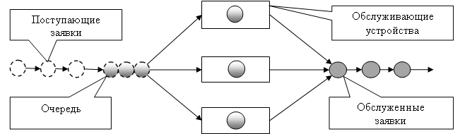 Обслуживающие устройства (приборы, каналы) производят обслуживание своей заявки (поступившей на вход) в соответствии с заданным детерминированным или случайным законом распределения. Обслуженная заявка поступает в выходной поток, который отличается от входного и зависит от дисциплин очереди и обслуживания.