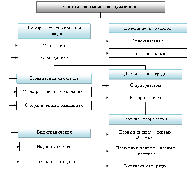 Таким образом, встаёт вопрос о классификации СМО (рис. 27). Можно использовать большое разнообразие моделей СМО и подходов к их классификации. Обычно используются следующие классификационные признаки: организация потока заявок; характер образования очереди; ограничения очереди; количество обслуживающих каналов; дисциплина очереди.