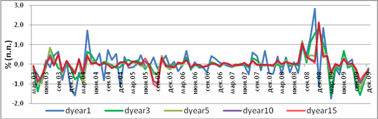 где учитываются динамические свойства изменчивости рядов процентных ставок. Возможность построения данной модели обеспечивает интегрированность первого порядка рядов доходности разной срочности облигаций в уровнях. Динамика трансформированных в приросты рядов доходности представлена на графике ниже (рис. 6):