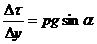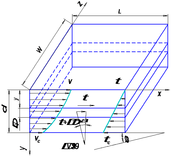 Вырежем мысленно из потока слой жидкости толщиной Δу, длиной L, и шириной W и составим уравнение равновесия сил, действующих на слой в проекциях на ось х: