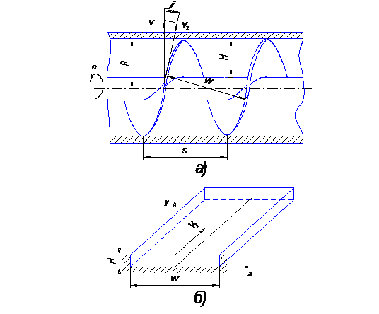 В упрощенной гидродинамической теории червячных нагнетателей сложный межвитковый канал червяка (рис. 35а) заменяют расчетной схемой в виде прямоугольного канала (рис. 356) с одной подвижной верхней стенкой. При этом использован принцип обращения движения червяка и цилиндра, в котором вращается червяк. Полагают мысленно, что червяк неподвижен, а вращается цилиндр с угловой скоростью червяка.