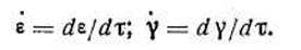 Скорость деформации (градиент скорости) учитывают, если деформации изменяются во времени τ (в с) при неустановившемся процессе; при установившемся процессе деформирования изменение деформации в единицу времени постоянно. Все это описывается понятием «скорость деформации» — ε (в с-1) при растяжении— сжатии и у (в с-1) при сдвиге: