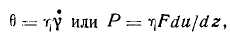 где η| — коэффициент динамической, или абсолютной, вязкости, Па-с; характеризует величину усилий, возникающих между двумя элементарными слоями жидкости при их относительном смещении; γ — скорость деформации, с-1; Р — сила сопротивления между двумя элементарными слоями, Н; F — площадь поверхности соприкосновения этих слоев, м2; du/dz — градиент скорости, т. е. интенсивность изменения скорости по нормали к ее вектору, с-1.
