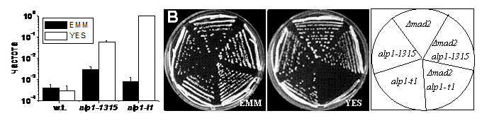 Частота потери минихромосомы в клетках alp1-1315 в 7.5 раз выше, а в клетках с мутацией alp1-t1 только в 2 раза выше, чем в клетках дикого типа, а в клетках дикого типа частота потери минихромосомы статистически не отличается на обеих средах. Частота потери минихромосомы в клетках alp1ts сильно возрастает, если клетки были высеяны на богатую среду: alp1-1315 клетки показали увеличение в 200 раз относительно контроля (Рис. 1A ), а в клетках с мутацией alp1-t1, выросших на YES, каждая колония содержала красный сектор, что указывает на потерю минихромосомы в первом же после высева делении (Рис.1A).Таким образом, частота потери минихромосомы в клетках с мутациями в гене, кодирующем кофактор D, зависит от среды, на которой растут клетки.
