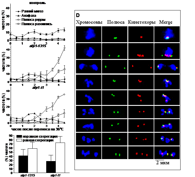 Основываясь на интенсивности кинетохор-ассоциированных сигналов в клетках с разошедшимися полюсами (Рис.2D, панели f – i), было оценено, что примерно в ~ 40% клеток с мутацией alp1-1315 и в ~ 30% клеток с мутацией alp1-t1 хромасомы сегрегируют неравным образом (Рис.2E). И хотя в клетках с мутациями в гене alp1+ хромосомы растягиваются как в анафазе, это происходит, минуя стадии прометафазы и метафазы. То есть хромосомы в этих клетках не собираются в метафазную пластинку и не претерпевают прометафазных осцилляций (конгрессии), которые происходят в культуре дикого типа на стадии, когда кинетохоры находятся на линии между полюсами (Рис.2D, панель b). Так как на молекулярном уровне кинетохор-микротрубочковое взаимодействие во время биориентирования