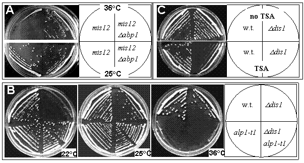 Рис.4 Анализ генетических взаимодействий и чувствительности к TSA. A. Dabp1 частично супрессирует температурную чувствительность mis12-537. На фото показывают mis12 (SPM 115) и mis12 Dabp1 (SPM 125) клетки, выращенные на YES 4-5 дней при 36°C (сверху) и 25°C (снизу) (сделано П. Мардановым). Медленный рост двойного мутанта обусловлен присутствием мутации Dabp1 (Halverson et al.1997). B. alp1-t1 супрессирует холодочувствительность Ddis1. Дикий тип (SPW 20), alp1-t1 (SP26), Ddis1 (McI#535) и Ddis1 alp1-t1 (два незевисимо изолированных штамма, имеющих идентичный фенотип как у SPM 190). Клетки были расстрикованы до единичных колоний на YES, чашки инкубировали при обозначенных температурах 3-6 дней. Такие же результаты были получены с мутацией dis1cs (не показано; Ohkura et al. 1988). C. Ddis1 гиперчувствителен к TSA. Дикий тип (SPW 20) и Ddis1 (McI#535) клетки были расстрикованы до единичных колоний на YES с добавлением 0.2% DMSO (сверху) или с 0.2% DMSO и TSA (10 mg/ml) (снизу) и проинкубированы 3 дня при 32°C.