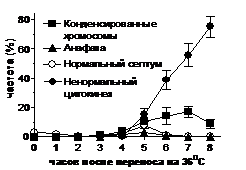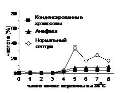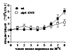 3. Причиной гибели клеток с мутацией кофактора D alp1-1315 после переноса на 36oC во втором клеточном делении (через 4-5 часов) является исчезновение неповрежденных микротрубочек (через 3 часа) вследствие инактивации мутантного белка Alp1-1315 (через 2 часа).