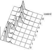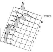 Процедура FACSсаn-анализа или проточной цитометрии была выполнена как описано в (Grishchuk et al. 1998). Примерно 1×107 кл/мл дрожжевых клеток, фиксировали в 70% этаноле, охлажденном до -20ºC, и хранили при 4ºC в течение нескольких дней. 15-100 мкл клеточной суспензии в 70% этаноле помещали в 1 мл 50 мM sodium citrate (Sigma) с 1 мг/мл RNAase для удаления РНК. После 2-4 часов инкубации при 37ºC, 5 мкг/мл propidium iodide (Sigma) был добавлен к клеточной суспензии для окраски ДНК. Окрашенные клетки разводили в 50 мM sodium citrate и мягко обрабатывали ультразвуком. Cодержание ДНК анализировали при помощи цитометра FACScan (Becton Dickinson, San Jose, CA). Контролем послужил гаплоидный штамм дикого типа в фазе активного роста.