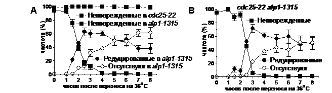 Клетки с мутацией alp1-1315 гибнут в первом митозе при 36°С после синхронизации в G1-фазе.