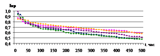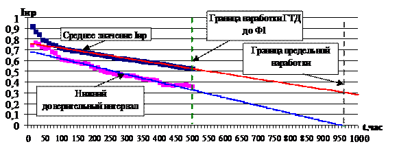 Расчет количественных значений интегрального показателя в зависимости от наработки двигателя в процессе эксплуатации отображен на графике (рис.3). Для определения нижнего доверительного интервала в расчетах были использованы эксплуатационные данные по нескольким наработкам авиационного ГТД ПС-90А до формы периодического ТО Ф1.